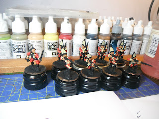 More French and Indian War figures have gone off to John from Kingscolours, another 10 British Regulars, 7 Rogers Rangers, 6 Canadian Militia plus a French and British artillery crew each of 4 figures. All are front Rank. Intention is to bring the British regulars up to six companies each of 8 figures including a light company and Grenadier company, I'm slowly working on the later now. I'm keeping all the facings the same buff colour so they represent a regiment on the table of 48 figures! In Sharpe Practice these groups can operate individually or collectively, seems daft to have loads of different facings.
