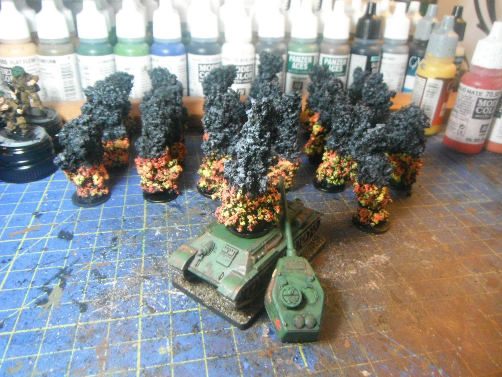 Much better than using cotton wool or synthetic fill I'd say, you can see the effect on the T34 in the pic below, explosion has blown off the turret leaving a fiery plume of smoke. Next up a spot of 15mm gardening as I work on a few Arcane Scenery houses and backyards.
